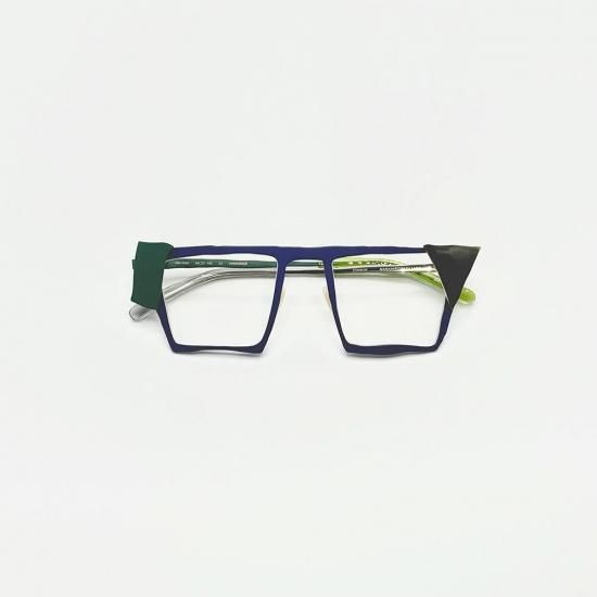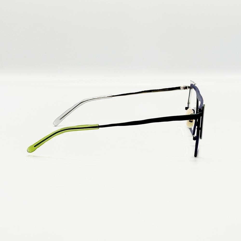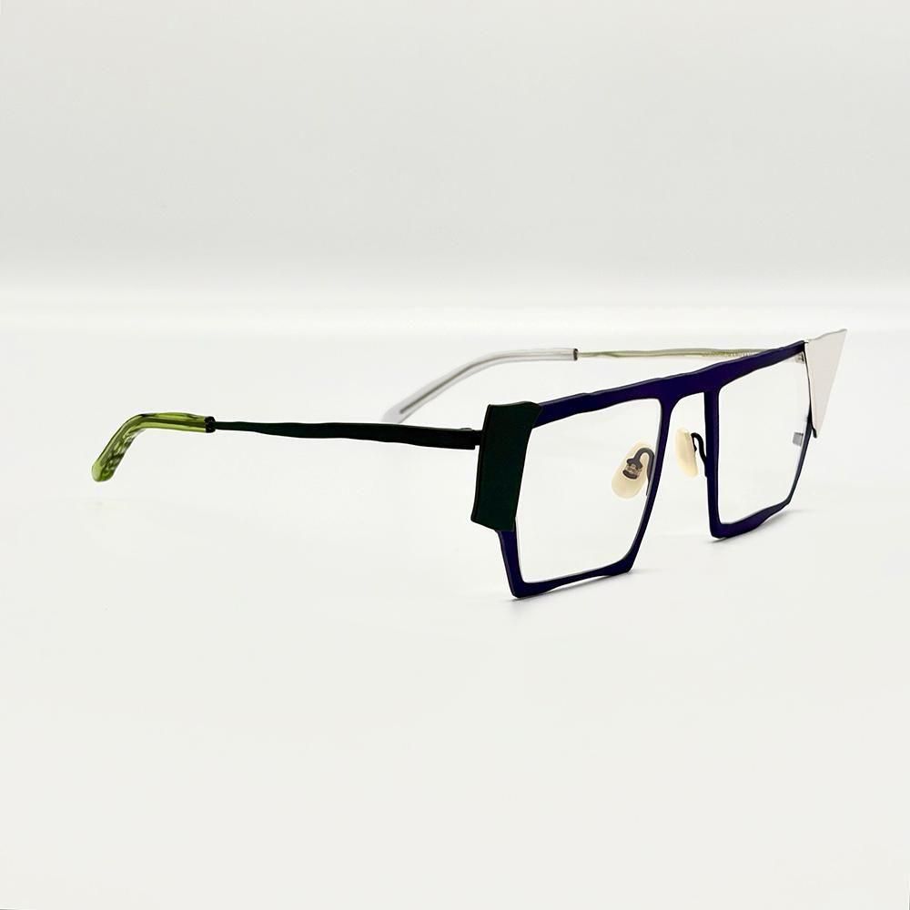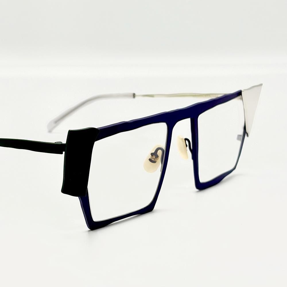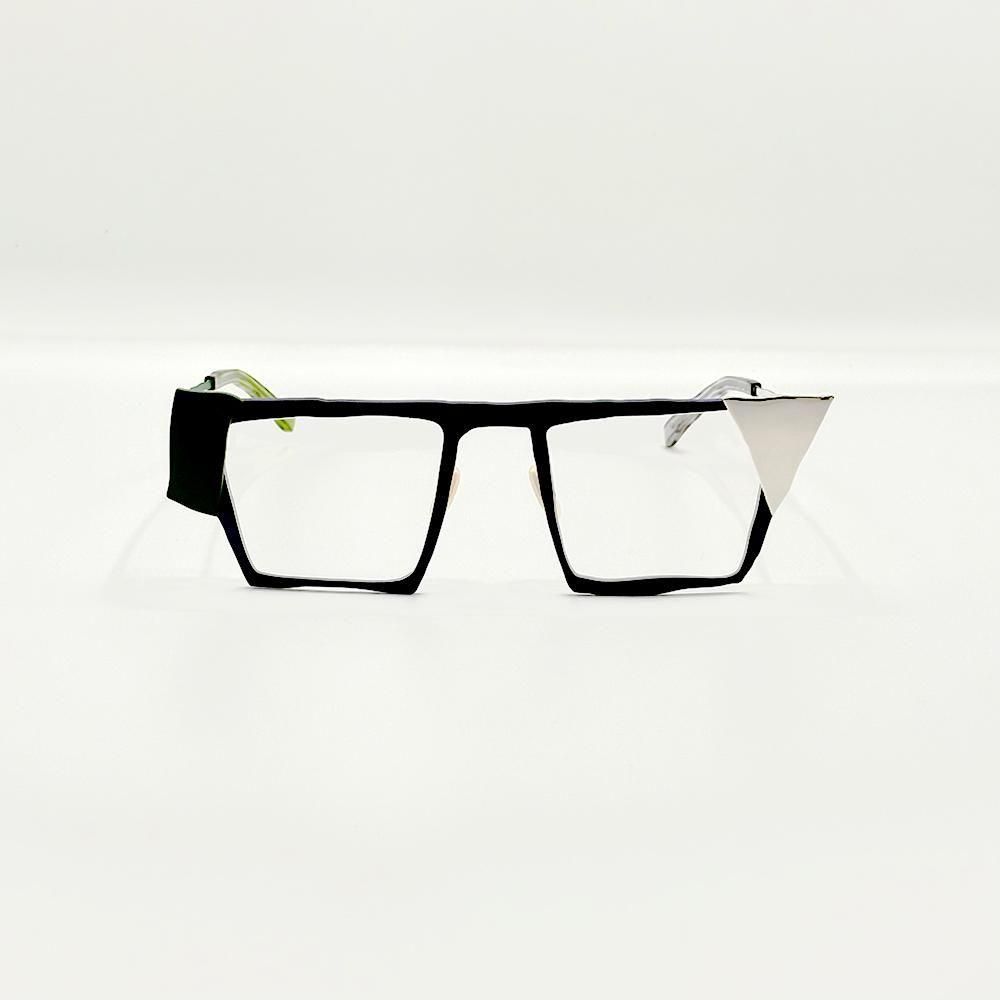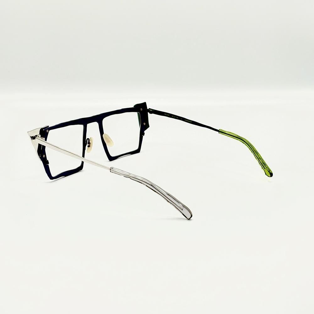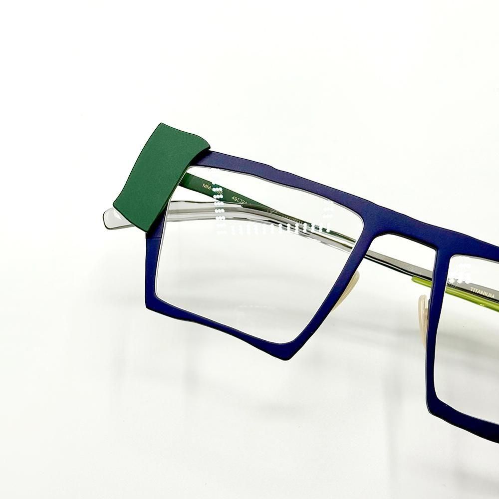 MM-0095は直線的なウェリントンシェイプのチタンフレームに、左は三角形、右には長方形のチタンパーツを取り付けている。アセテートフレームと比べると凹凸感は控えめながら、メタリックなカラーリングがアクセントとなり存在感は抜群。