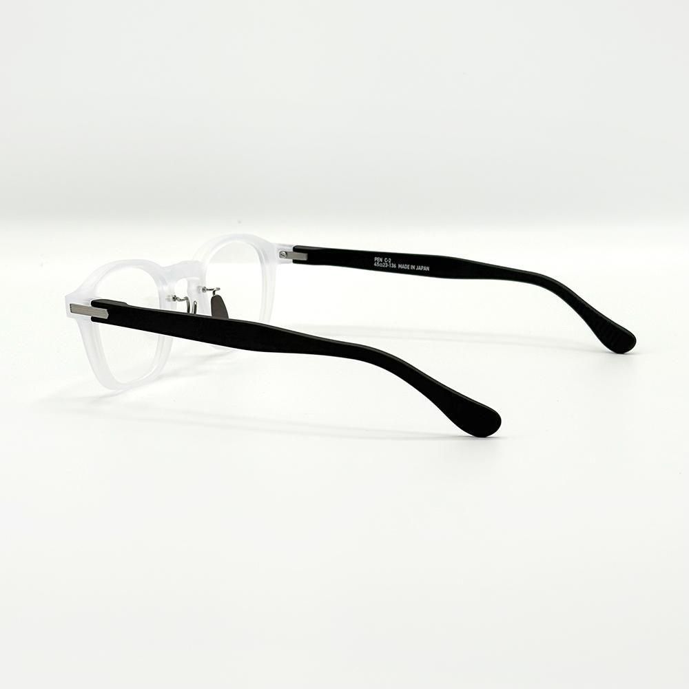 細身のリム、コンパクトなウェリントンシェイプのPEN。クラシカルなキーホールブリッジと未来的な素材感のミックススタイルがユニーク。