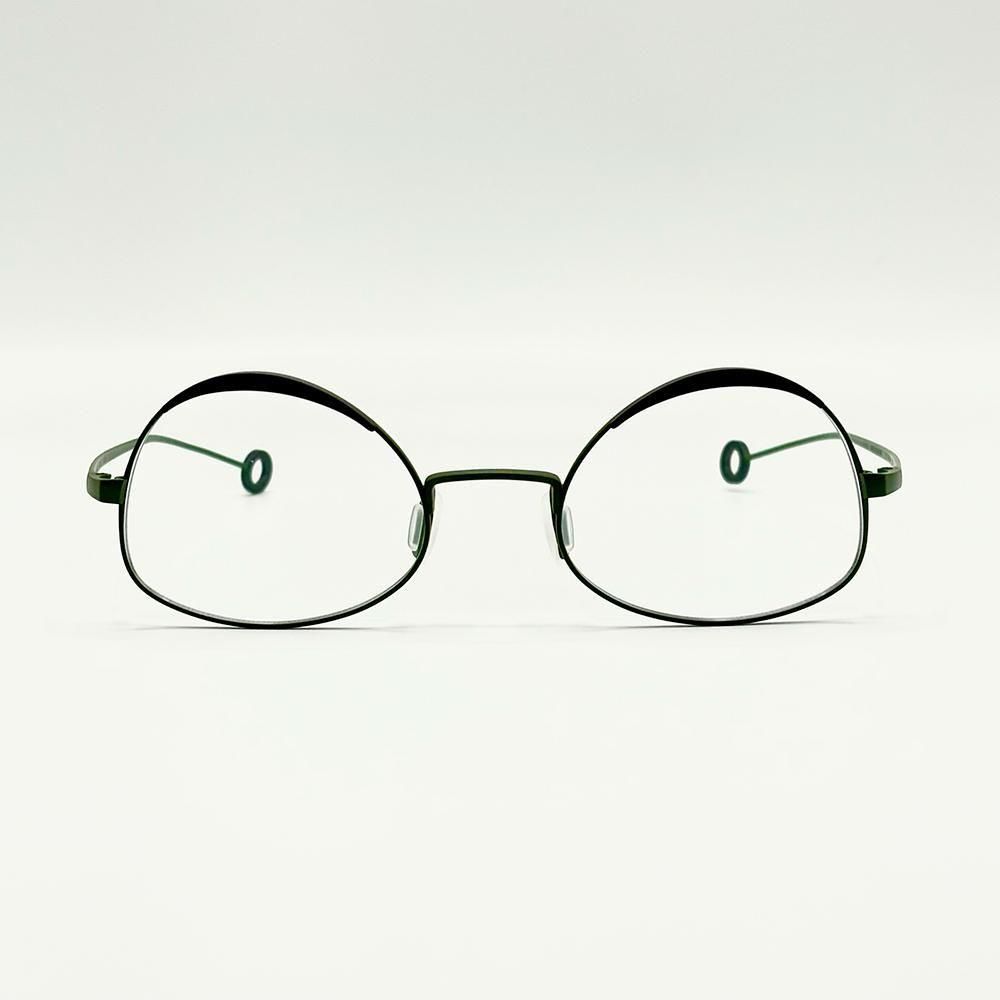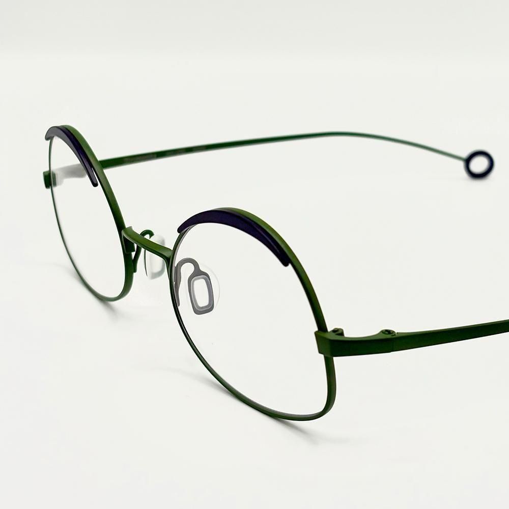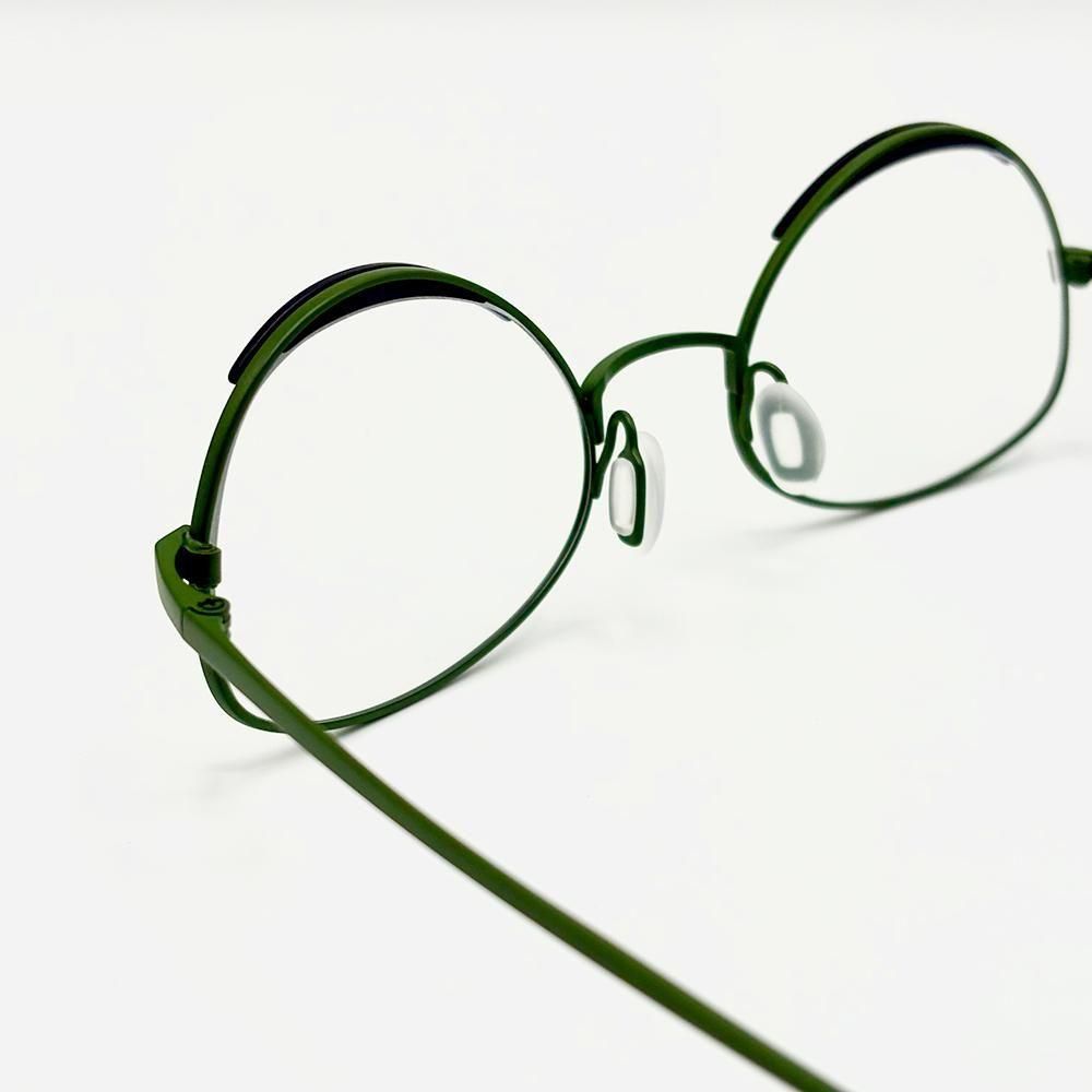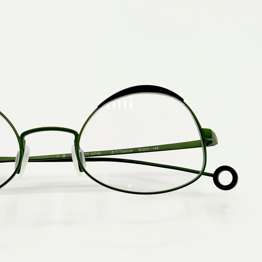コロンとしたおにぎりのような三角形のレンズシェイプに、アクセントとなるカラーバーが取り付けられた25E。にこやかな目元を作ってくれる。