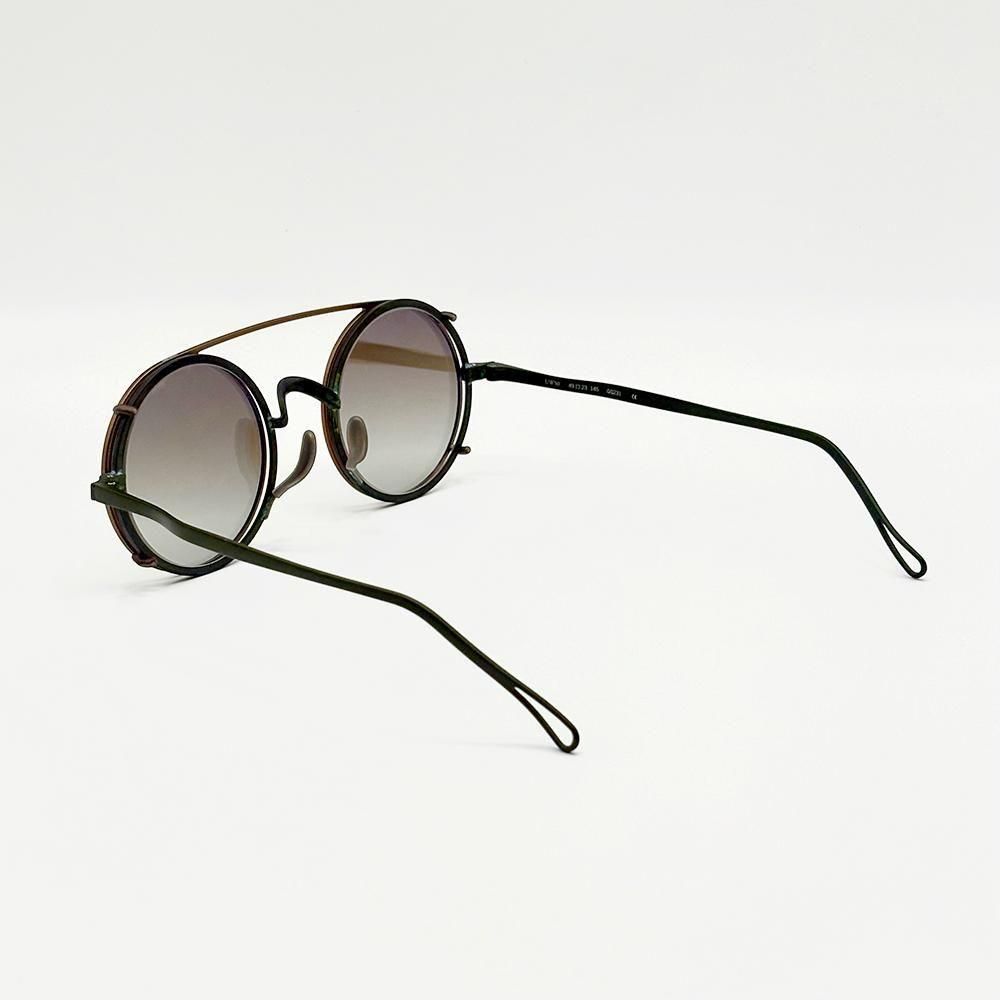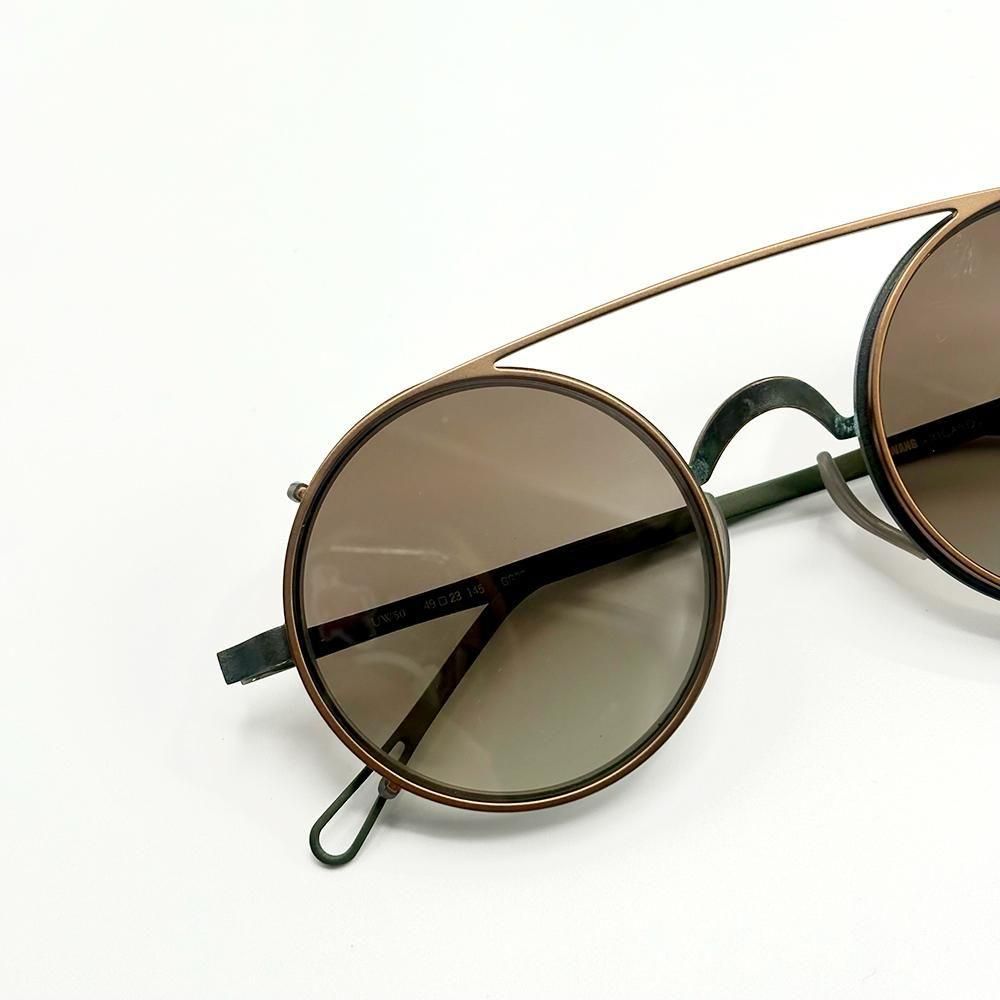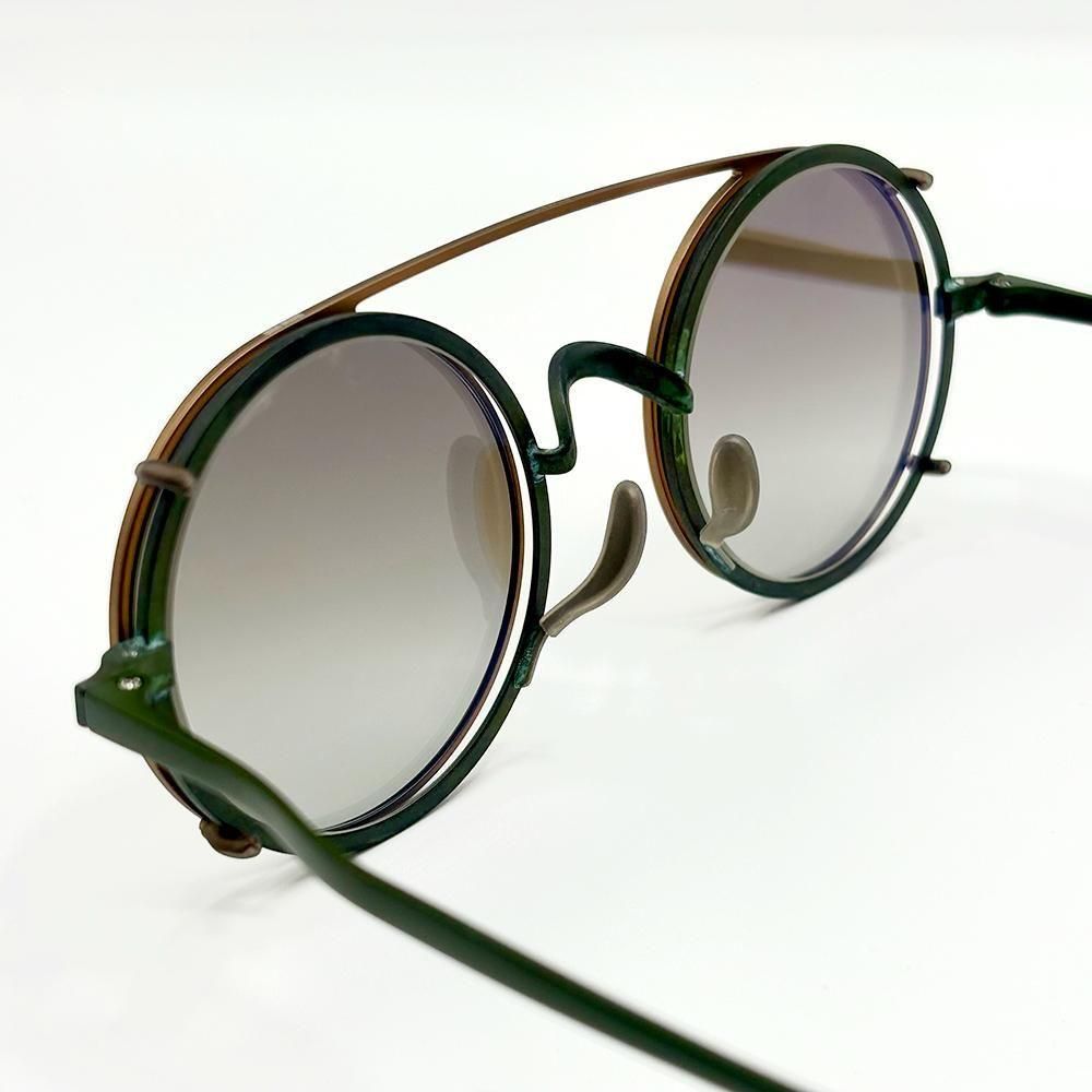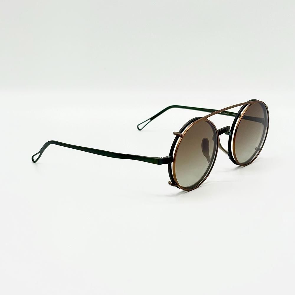 RIGARDSではあまり見かけないビッグシェイプのラウンドフレームに、あえての爪で引っ掛けるタイプのクラシックなクリップオンがセット。