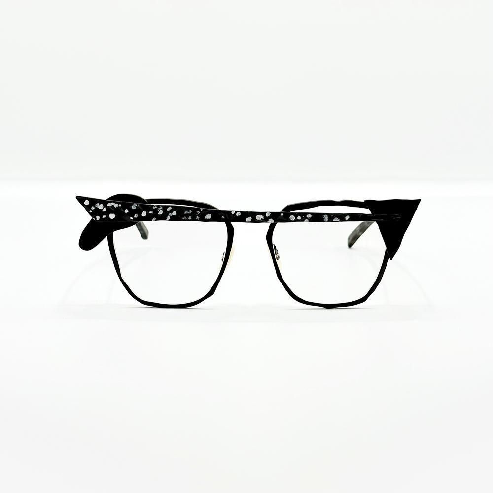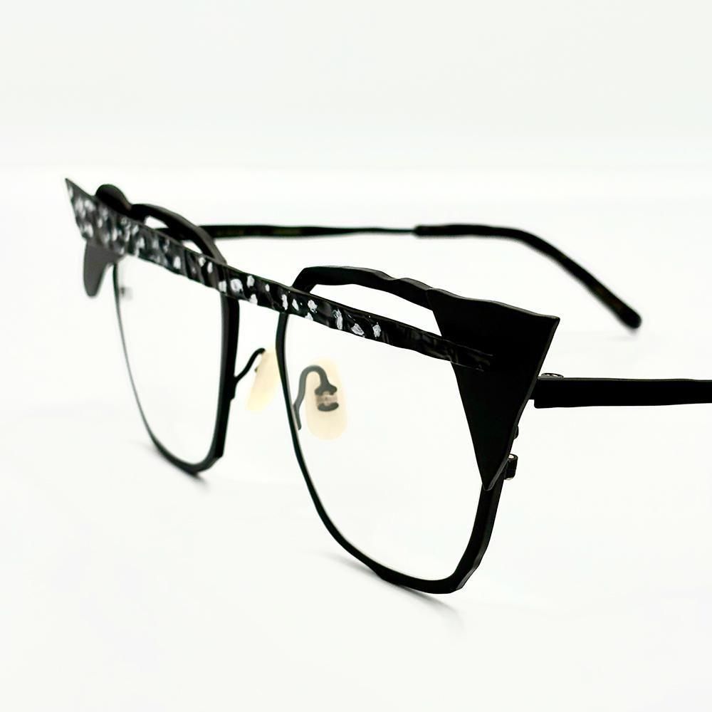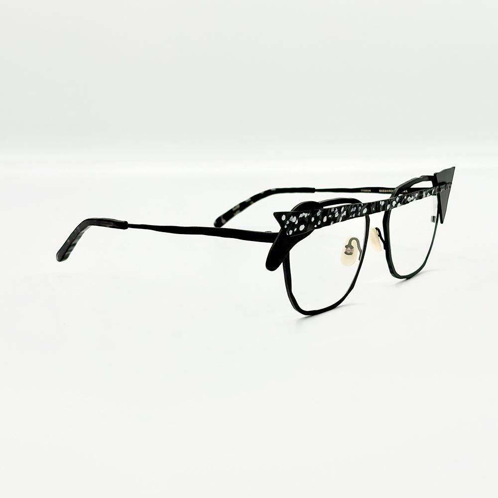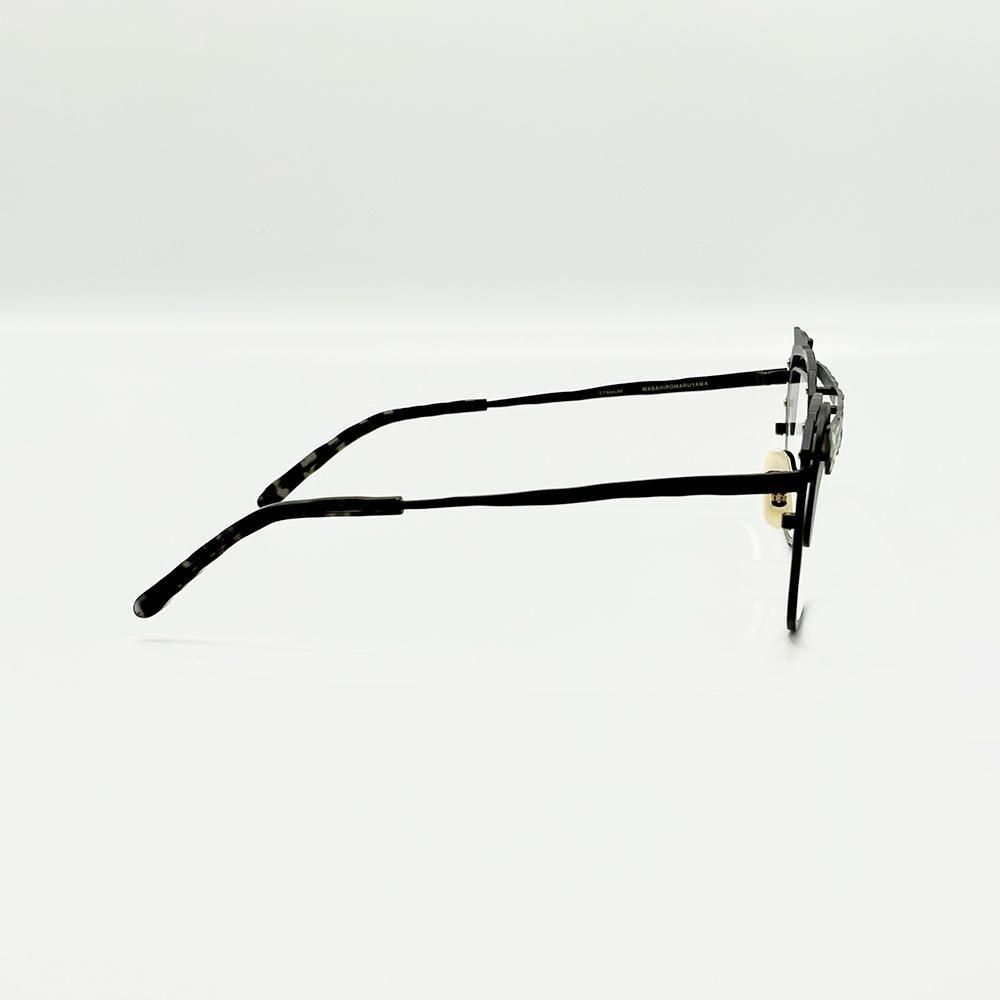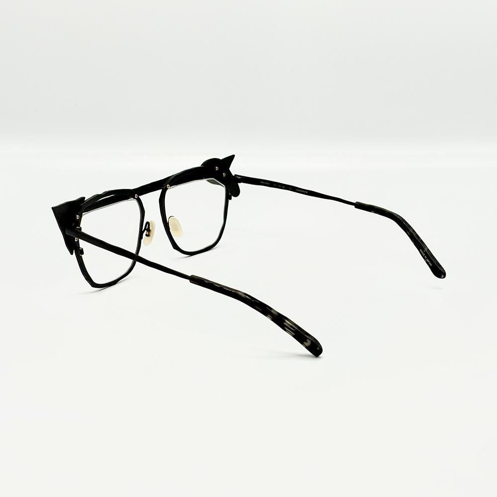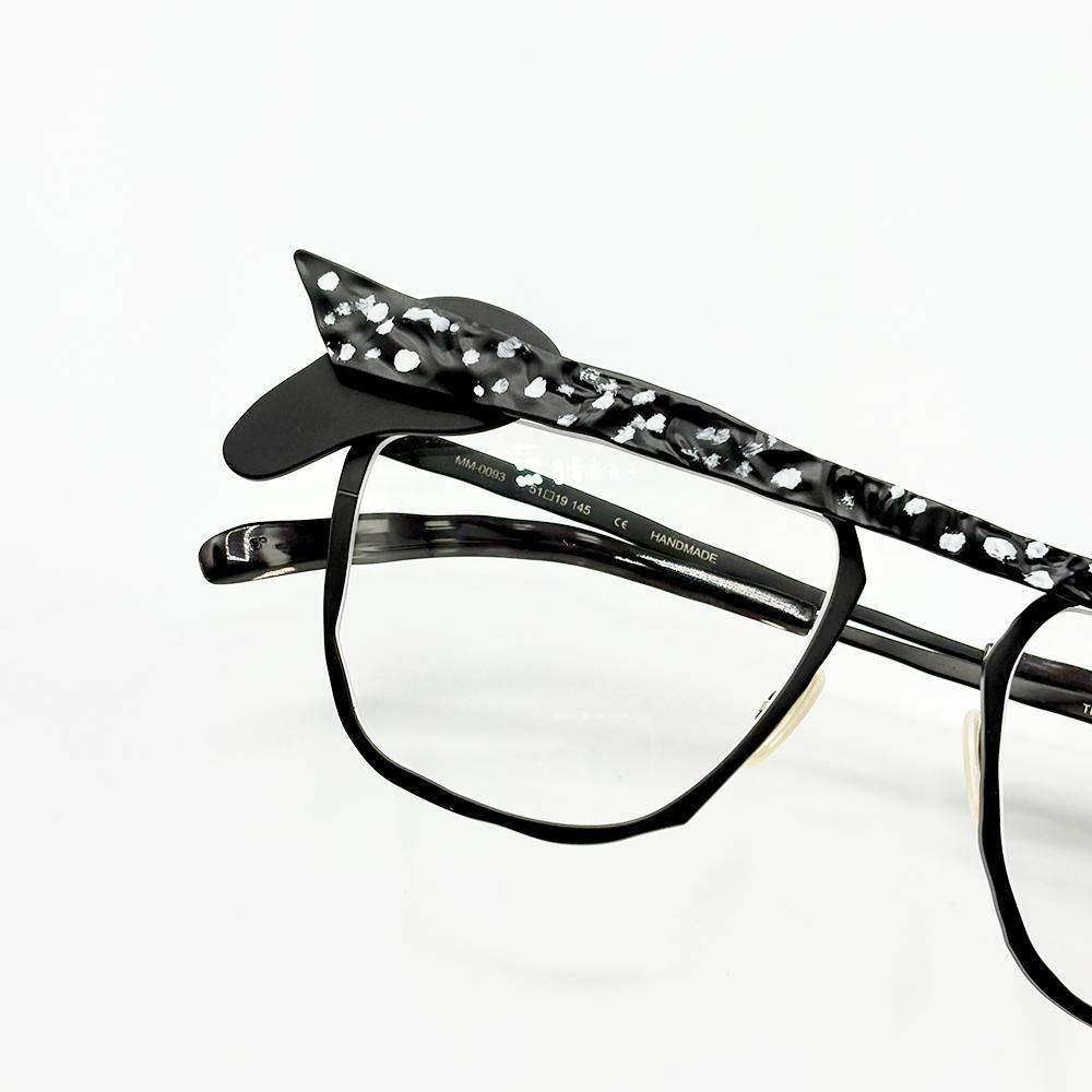 MM-0093はウェリントンシェイプのチタンフレームに、左は三角形、右には有機的な曲線形、そしてブロー部に凹凸感のあるメタリックなチタンパーツを取り付けている。アセテートフレームと比べると"段差"感は控えめながら、メタリックなカラーリングがアクセントとなり存在感は抜群。