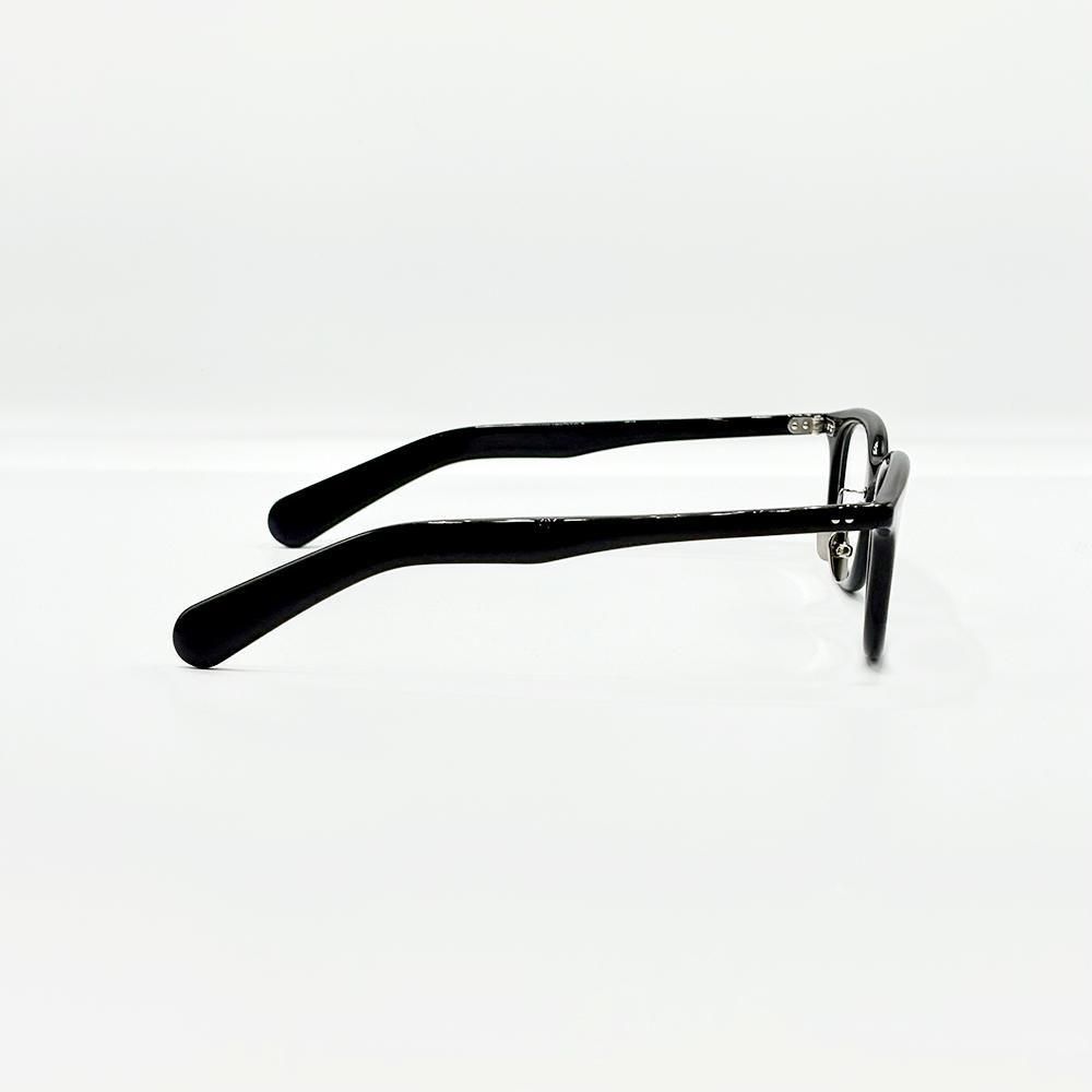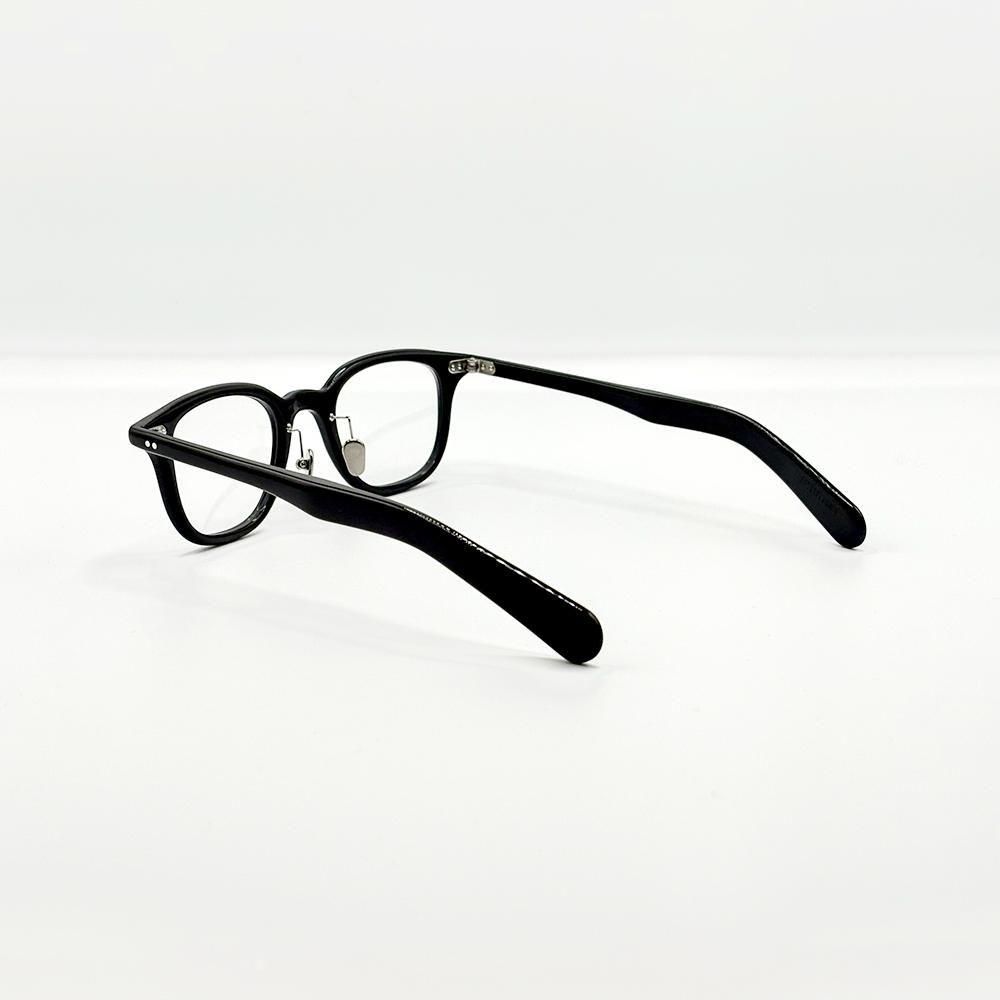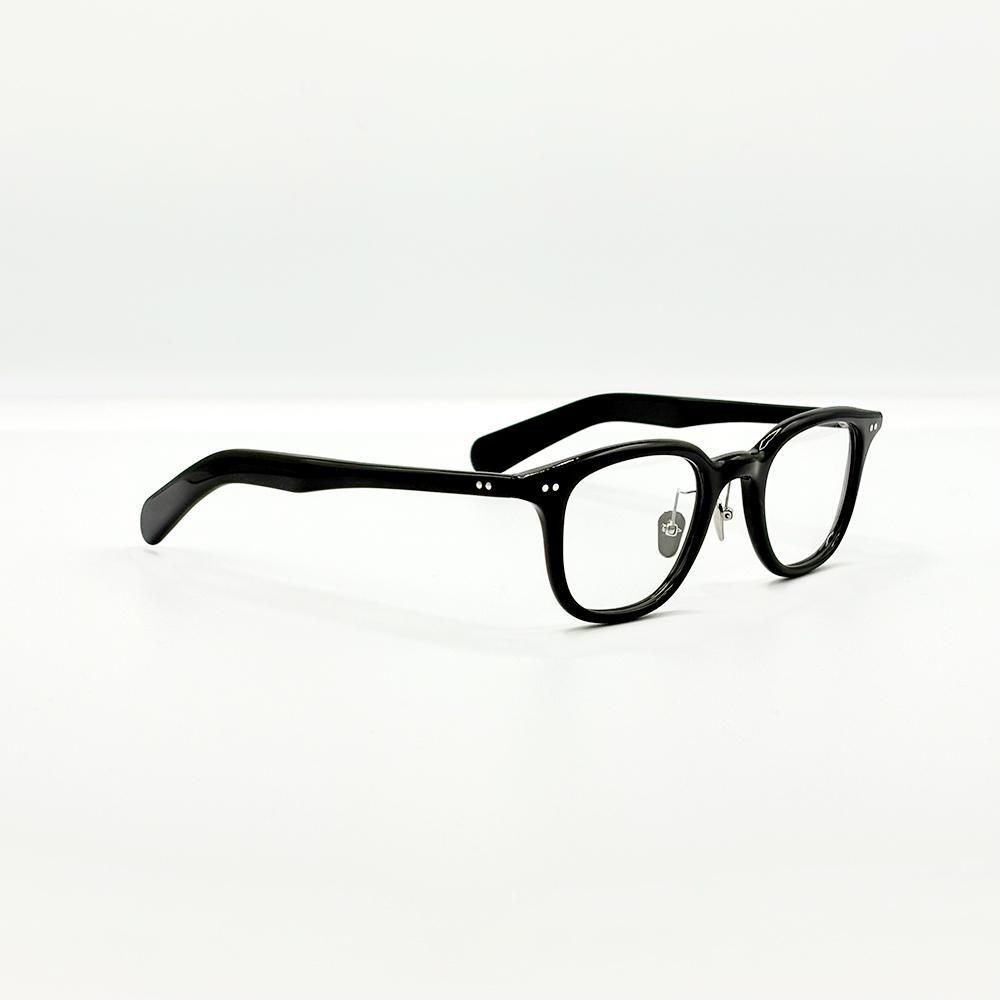 サイドに張り出したブローライン、かなりハの字に広がる鼻側のアウトラインなど、微妙な"違和感"が、表情豊か。甲丸に仕立てることで、柔らかなツヤ感とが引き立ち、またリムが一回り細く見え上品なシルエットに。太さや厚みに緩急をつけ、重量バランスを整えたテンプルの仕立ても良い。定番中の定番とも言えるウェリントンだからこそ、細部へのこだわりが光る。