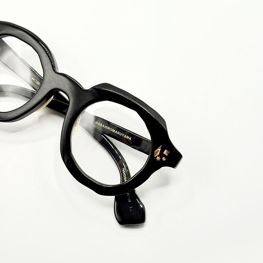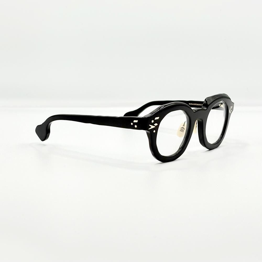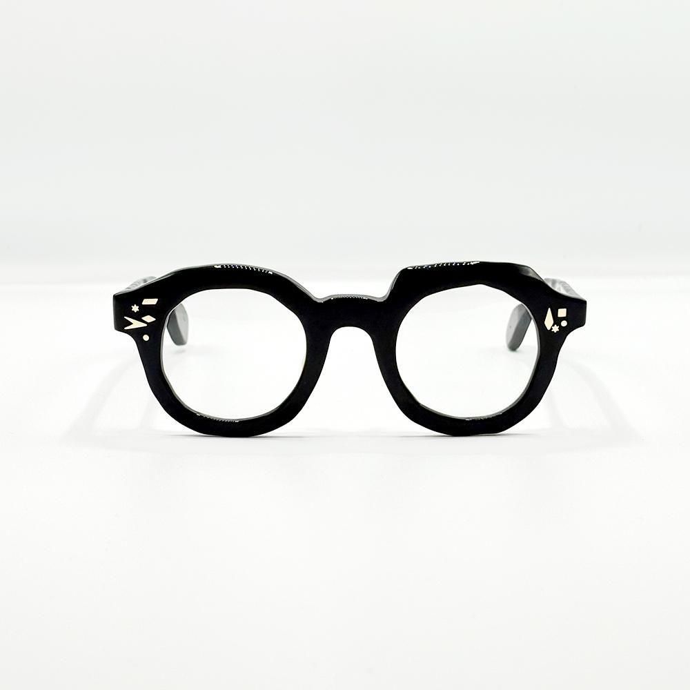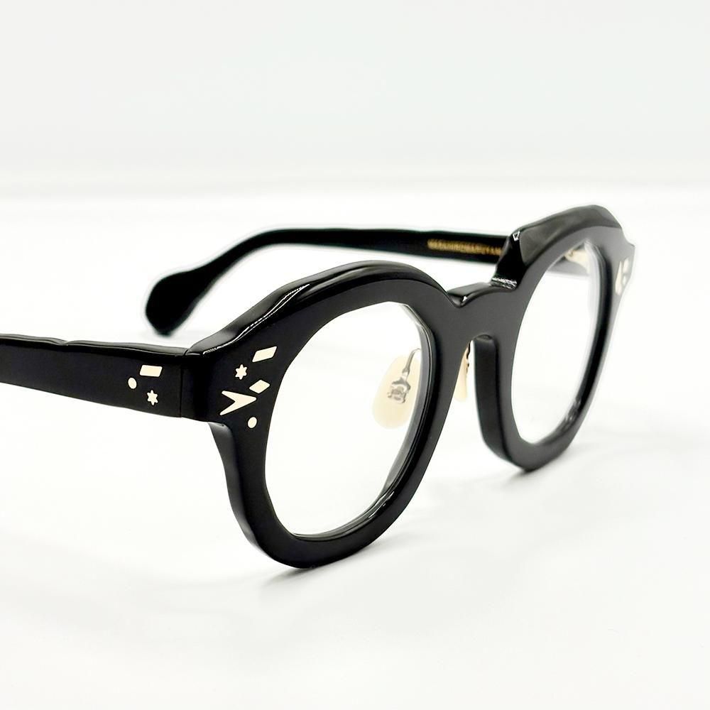 UNTITLED(無題)は、マサヒロマルヤマらしい、ボールドで、大ぶり、そして手描きのような歪なアウトラインのセルフレームに、様々な形状のカシメピンを散りばめたデザイン。ただの飾りではなく、一本一本がカシメピンとして機能している。そしてそのピンを支える自由な形状のオリジナル丁番も、鯖江のハイレベルな技術でしか実現できないもの。