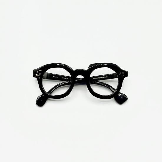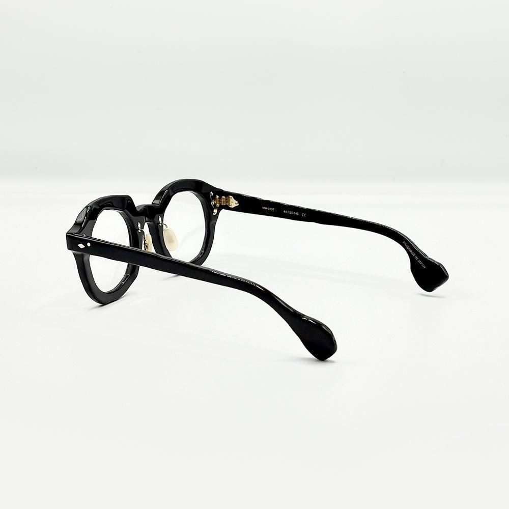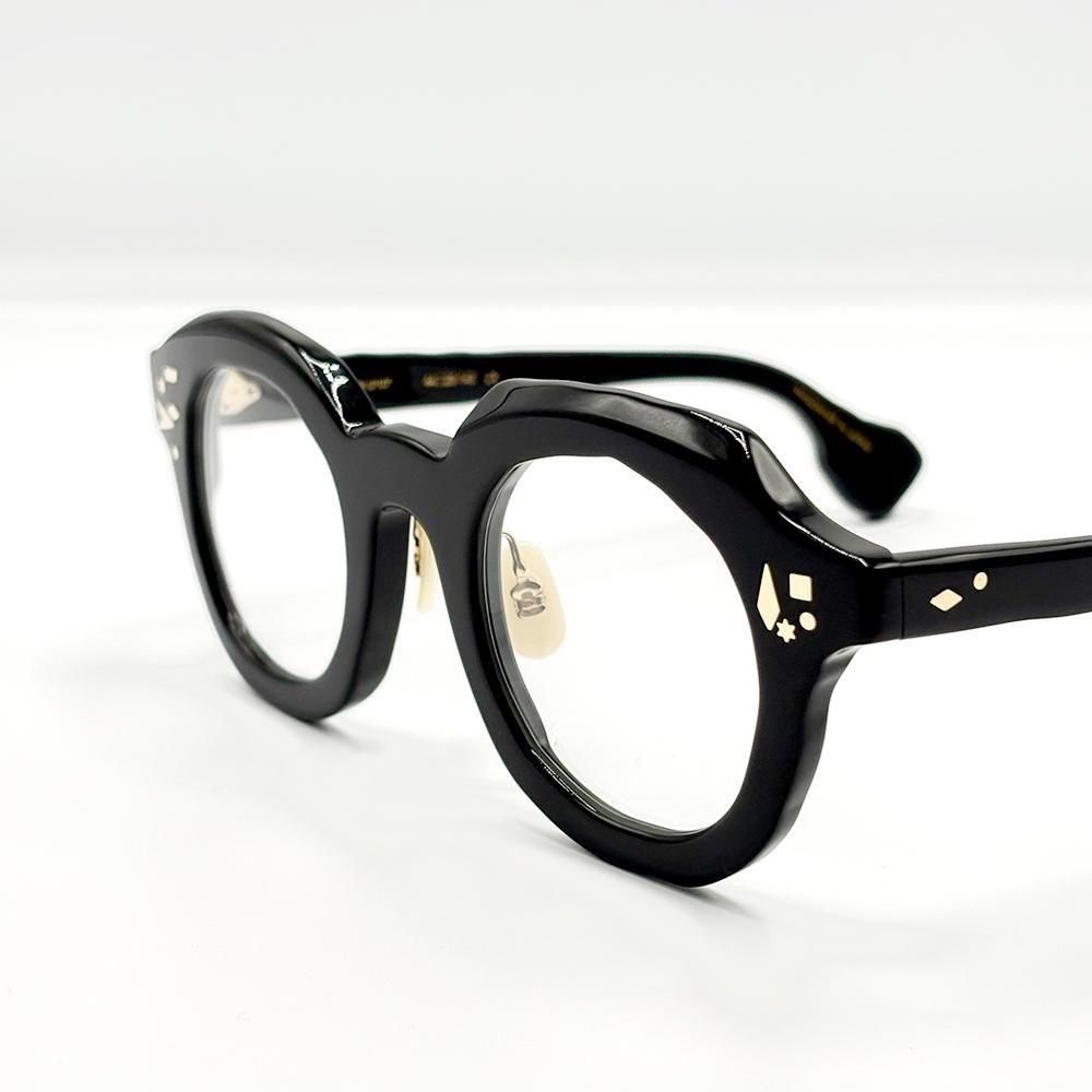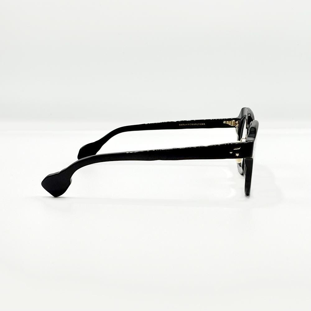 UNTITLED(無題)は、マサヒロマルヤマらしい、ボールドで、大ぶり、そして手描きのような歪なアウトラインのセルフレームに、様々な形状のカシメピンを散りばめたデザイン。ただの飾りではなく、一本一本がカシメピンとして機能している。そしてそのピンを支える自由な形状のオリジナル丁番も、鯖江のハイレベルな技術でしか実現できないもの。