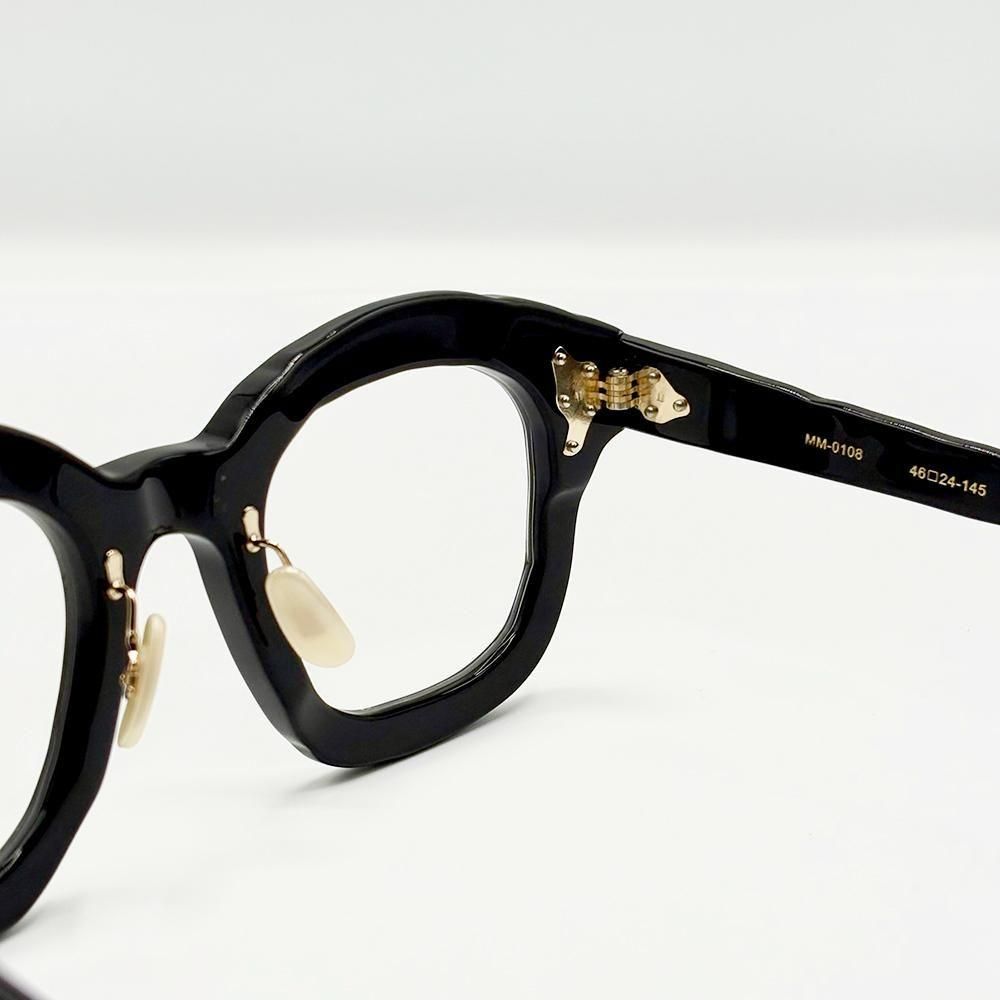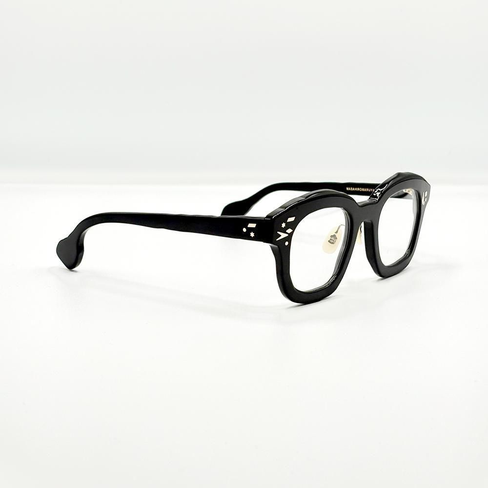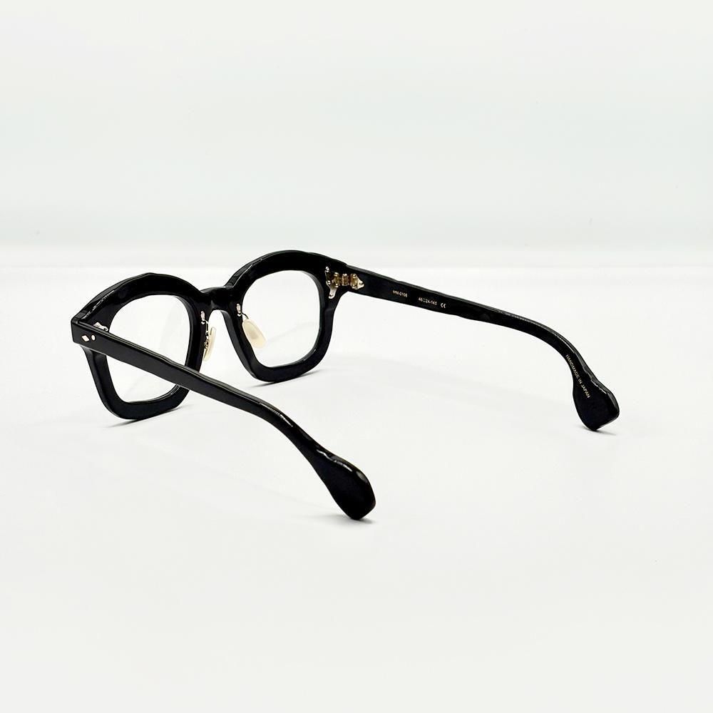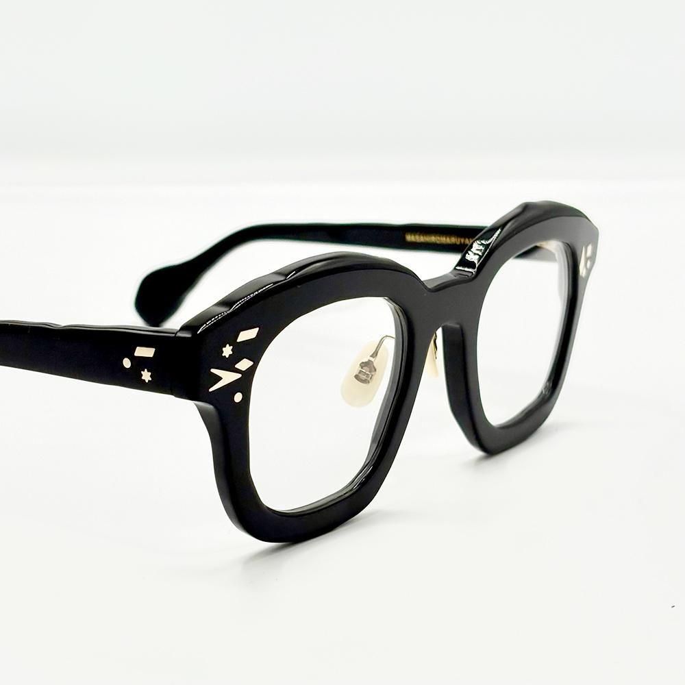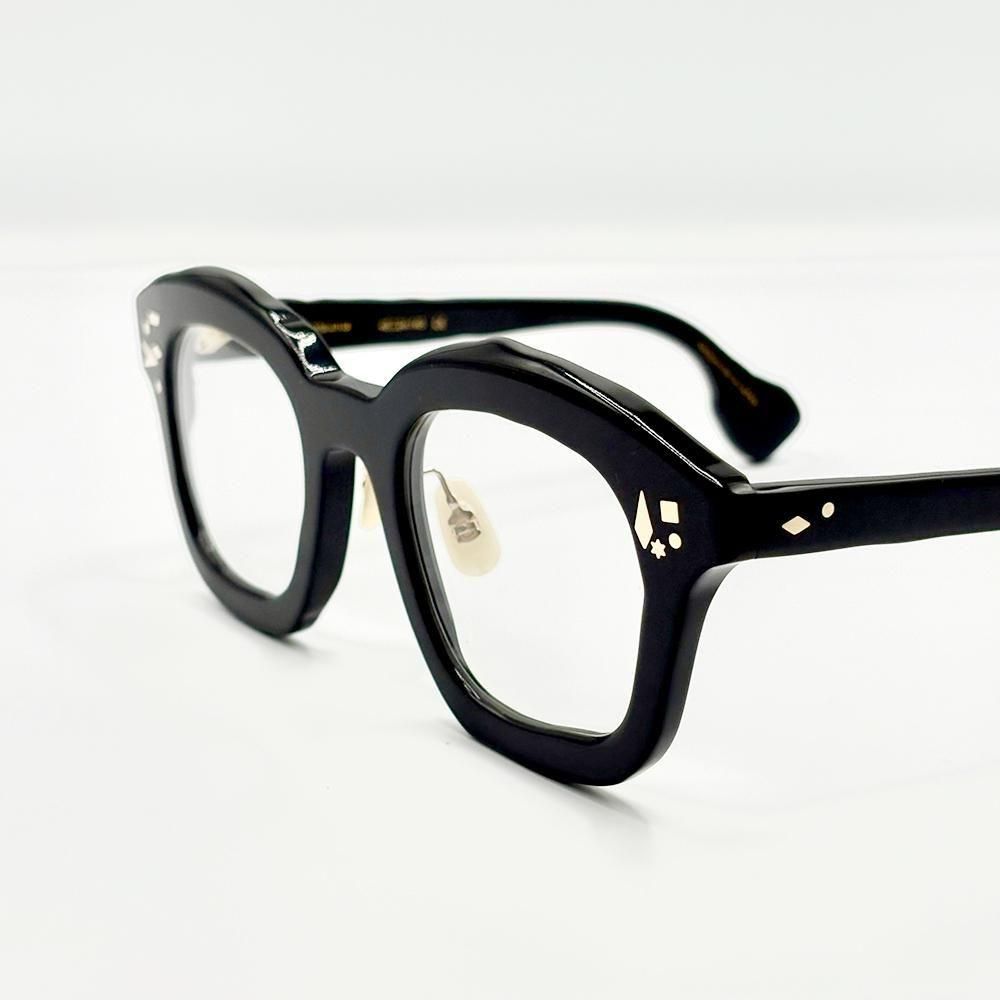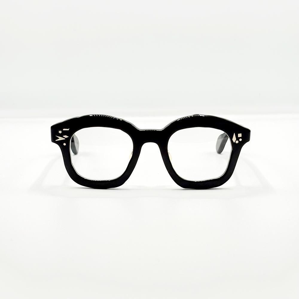 UNTITLED(無題)は、マサヒロマルヤマらしい、ボールドで、大ぶり、そして手描きのような歪なアウトラインのセルフレームに、様々な形状のカシメピンを散りばめたデザイン。ただの飾りではなく、一本一本がカシメピンとして機能している。そしてそのピンを支える自由な形状のオリジナル丁番も、鯖江のハイレベルな技術でしか実現できないもの。